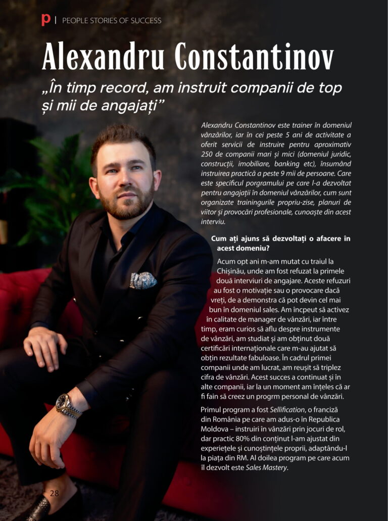 Alexandru Constantinov este trainer în domeniul vânzărilor, iar în cei peste 5 ani de activitate a oferit servicii de instruire pentru aproximativ 250 de companii mari și mici (domeniul juridic, construcții, imobiliare, banking etc), însumând instruirea practică a peste 9 mii de persoane. Care este specificul porgramului pe care l-a dezvoltat pentru angajații în domeniul vânzărilor, cum sunt organizate trainingurile propriu-zise, planuri de viitor şi provocări profesionale, cunoaşte din acest interviu.