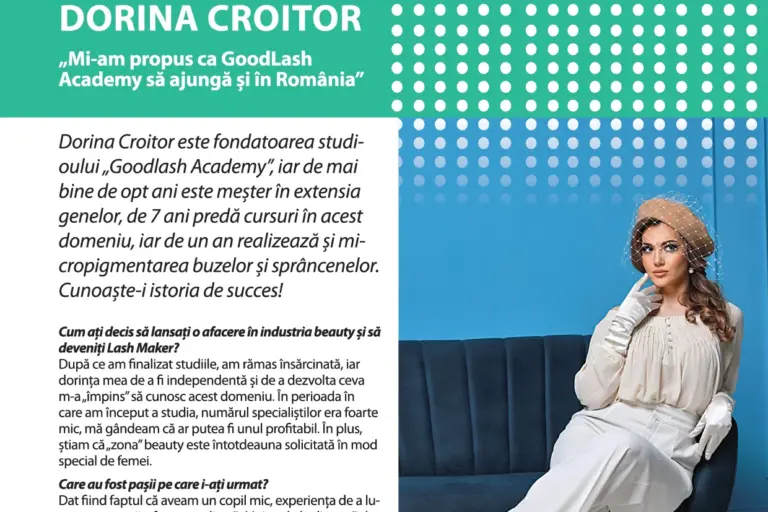 Dorina Croitor este fondatoarea studioului,,Goodlash Academy», iar de mai bine de opt ani este meşter în extensia genelor, de 7 ani predă cursuri în acest domeniu, iar de un an realizează şi micropigmentarea buzelor şi sprâncenelor. Cunoaşte-i istoria de succes!