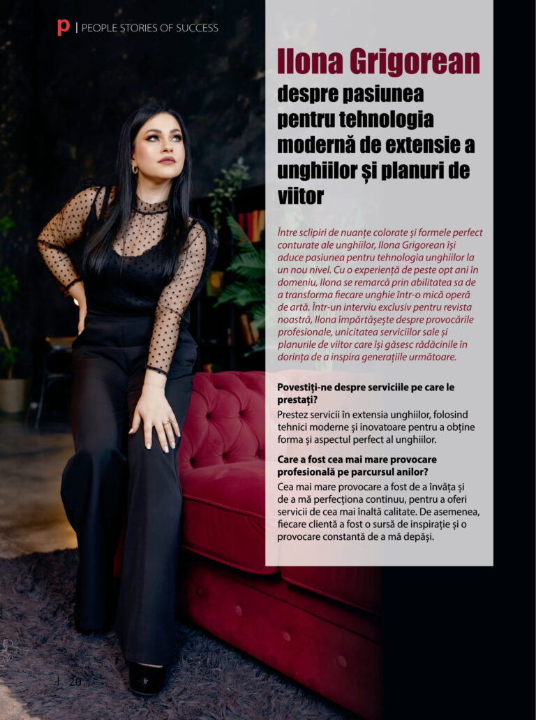Între sclipiri de nuanțe colorate şi formele perfect conturate ale unghiilor, Ilona Grigorean îşi aduce pasiunea pentru tehnologia unghiilor la un nou nivel. Cu o experiență de peste opt ani în domeniu, Ilona se remarcă prin abilitatea sa de a transforma fiecare unghie într-o mică operă de artă. Într-un interviu exclusiv pentru revista noastră, Ilona împărtăşeşte despre provocările profesionale, unicitatea serviciilor sale și planurile de viitor care îşi găsesc rădăcinile în dorinţa de a inspira generațiile următoare.