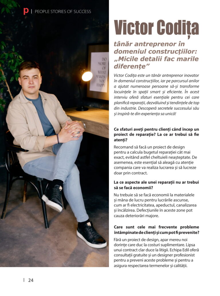 Victor Codita este un tânăr antreprenor inovator în domeniul construcțiilor, iar pe parcursul anilor a ajutat numeroase persoane să-şi transforme locuințele în spații smart și eficiente. În acest interviu oferă sfaturi esențiale pentru cei care planifică reparații, dezvăluind și tendințele de top din industrie. Descoperă secretele succesului său şi inspiră-te din experiența sa unică!
